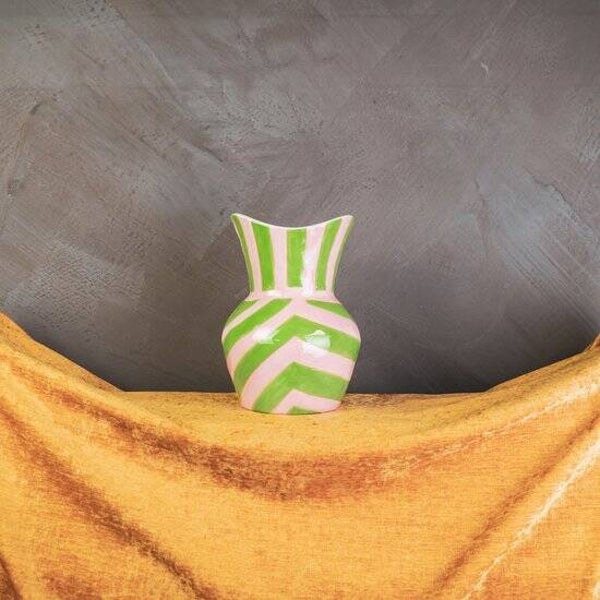 Deze keramieken vaas van Housevitamin heeft een glanzende afwerking met groene en roze strepen. Het ovale model en de frisse zuurstokkleuren maken het een opvallend, artistiek item. Mooi met of zonder bloemen als vrolijk accent in elk interieur.